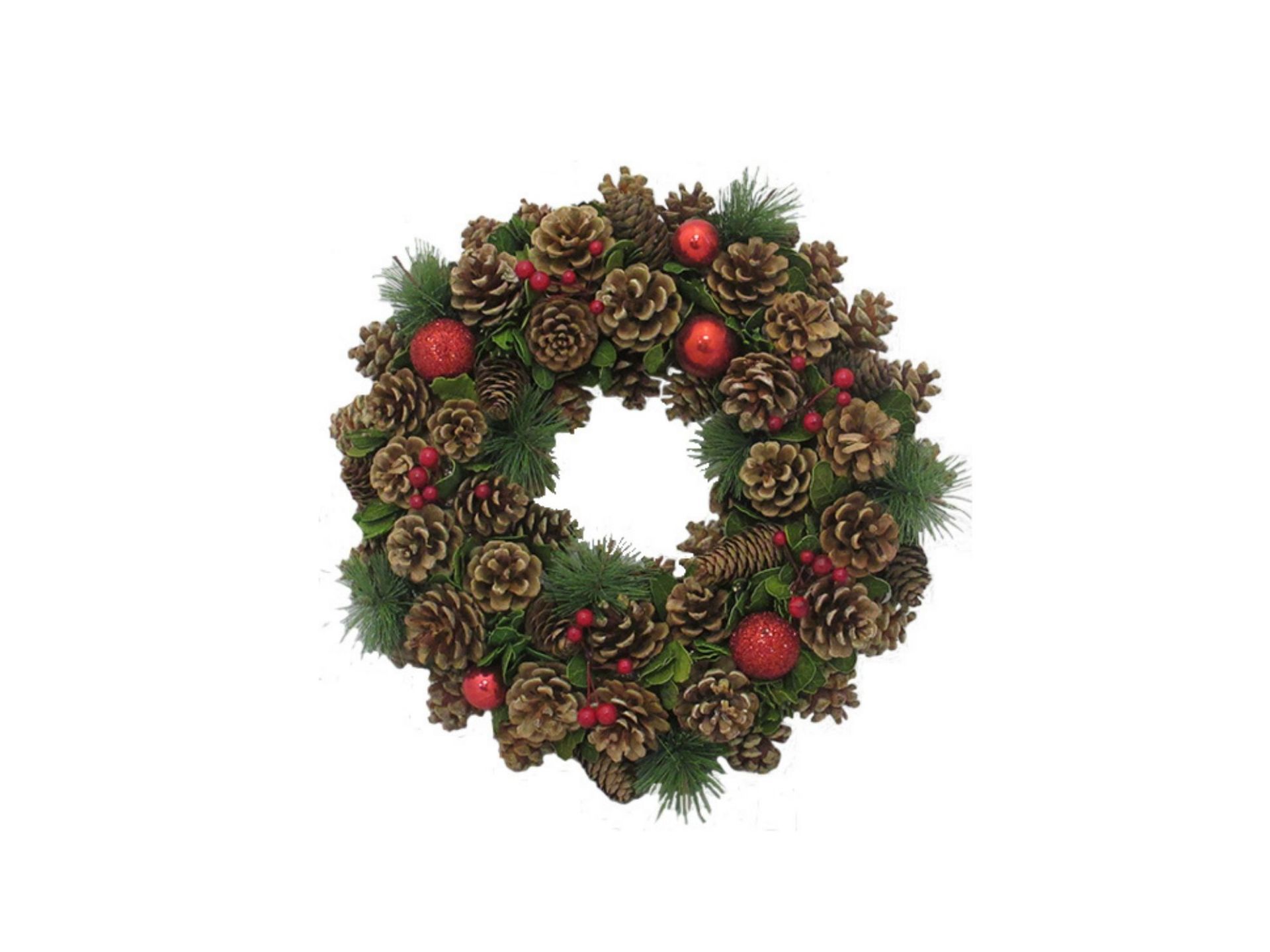 A natural-style decorative wreath featuring a mix of rustic materials including pine cones, berries, and baubles, arranged on a lightweight foam ring