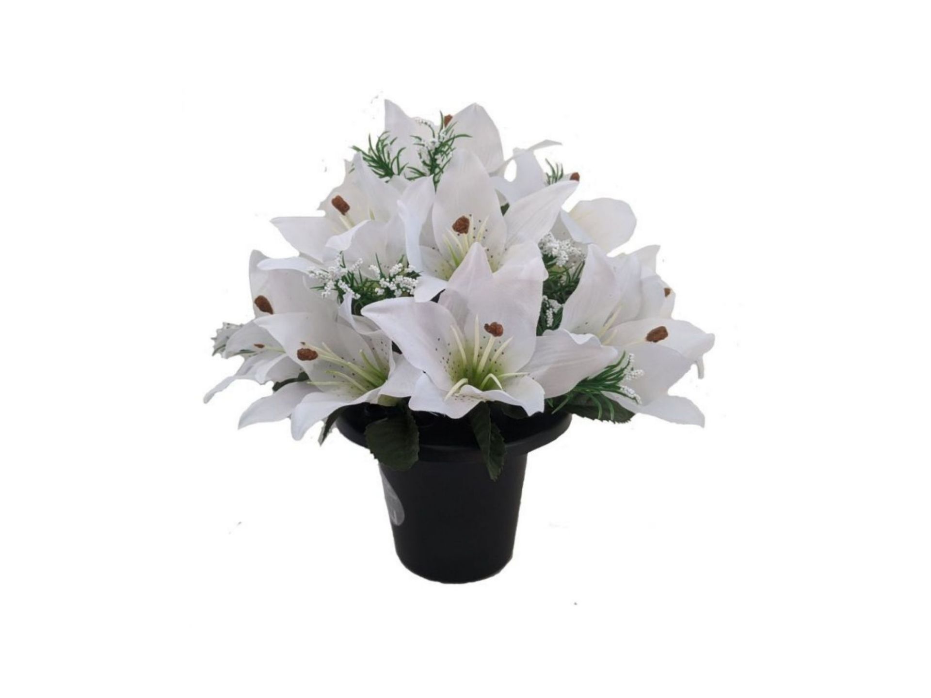 This crem pot features elegant silk Tigerlilies arranged with care to create a respectful and vibrant graveside tribute
