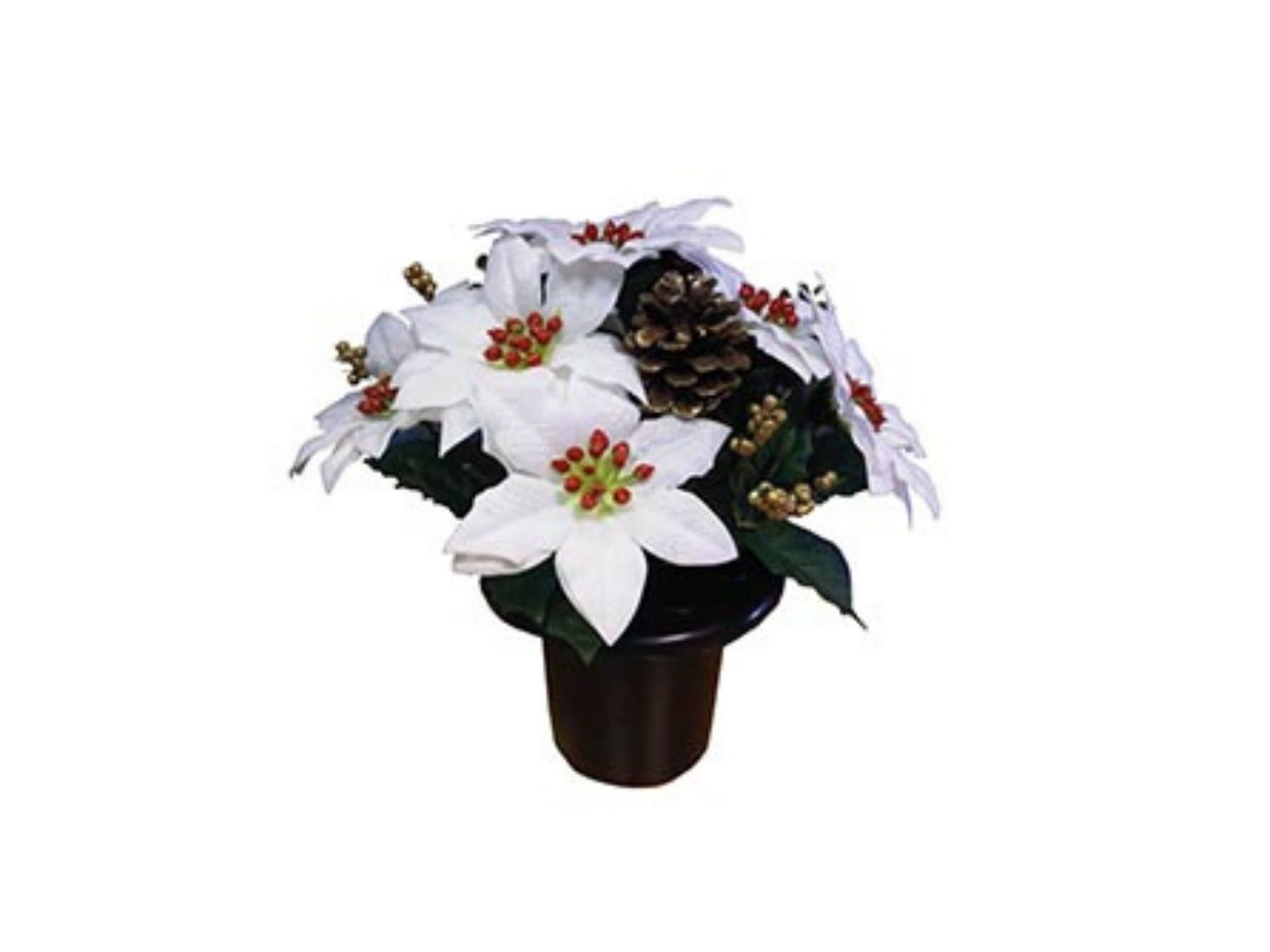 This crem pot features elegant white silk poinsettias arranged with care to create a respectful and vibrant graveside tribute
