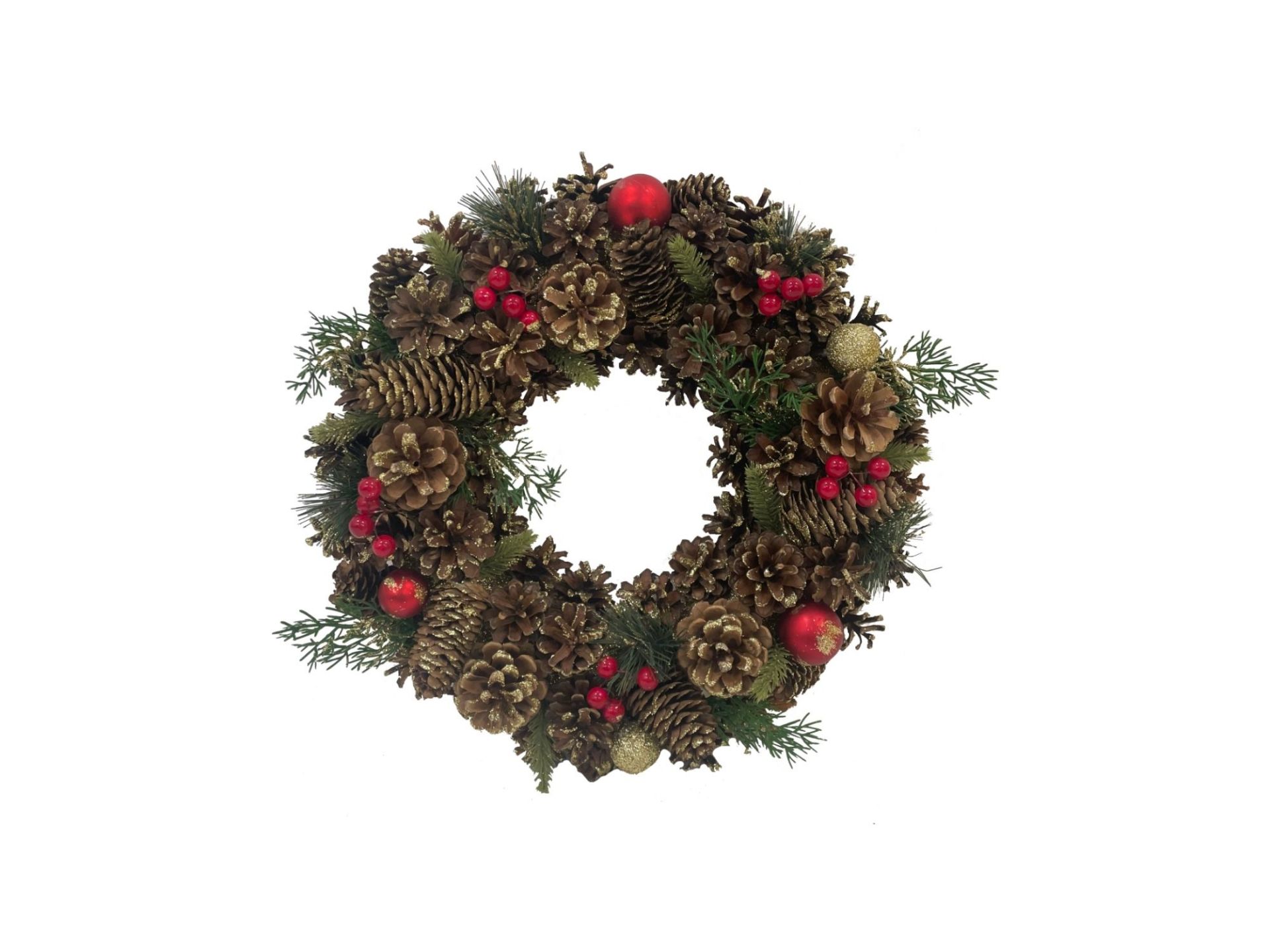 A natural-style decorative wreath featuring a mix of rustic materials including pine cones, fern leaf, and baubles, arranged on a lightweight foam ring