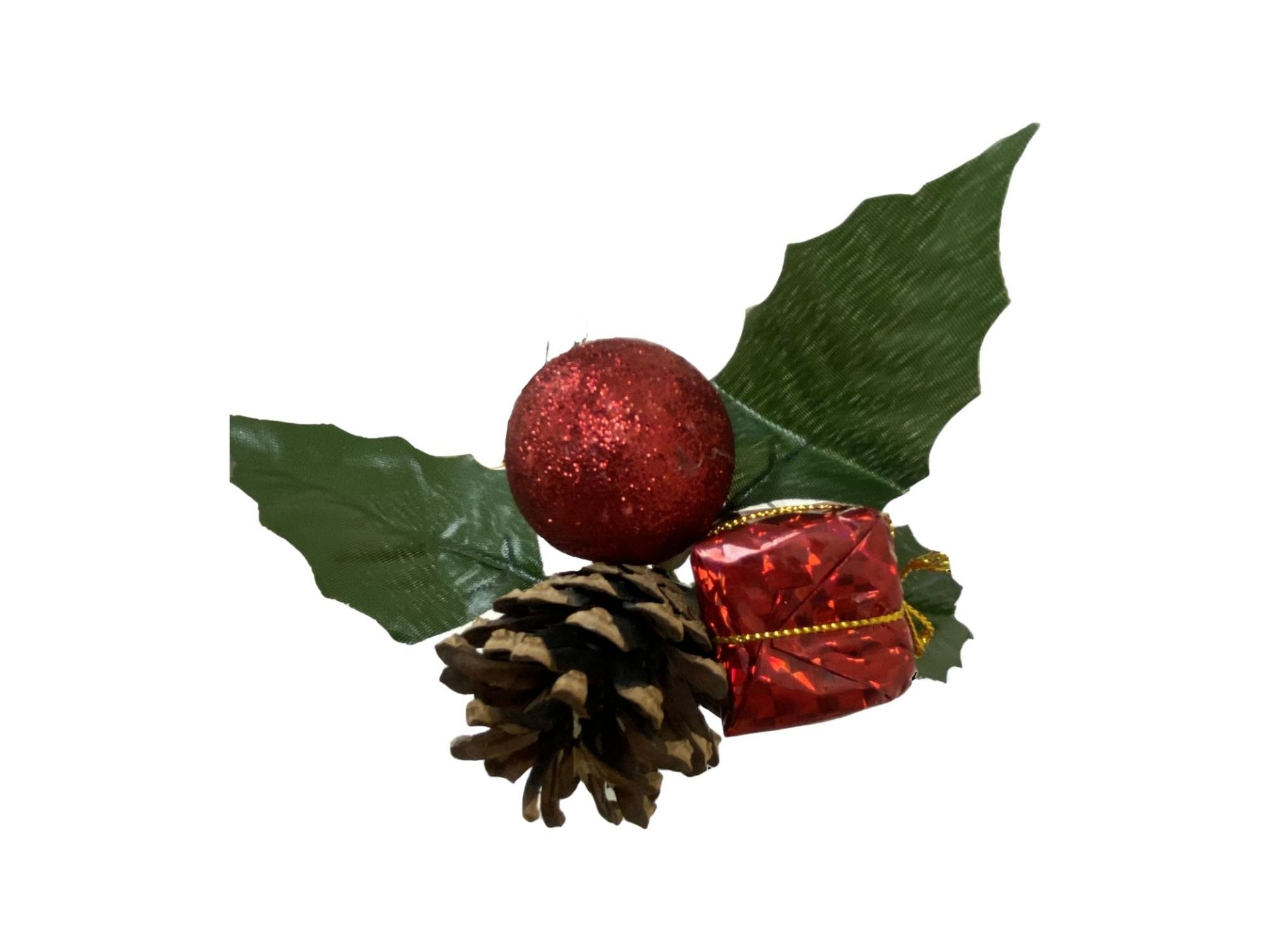 A classic seasonal embellishment, this Festive Pick features a large bauble, parcel, and natural cone